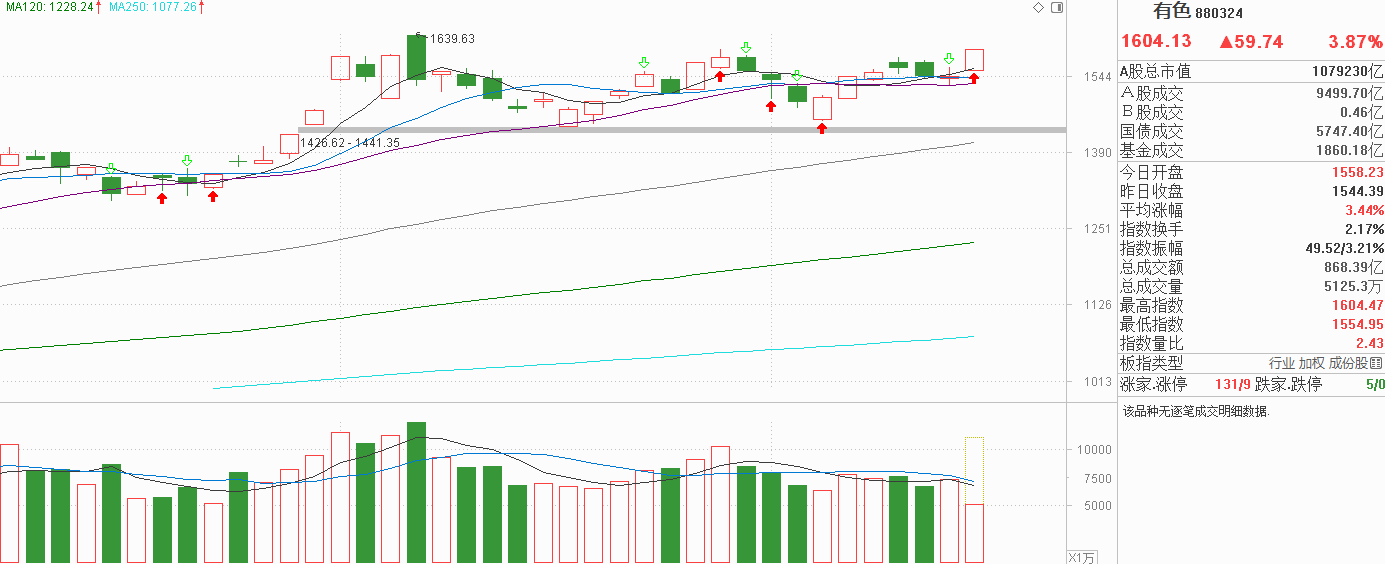 有色金属的朋友们,注意了!周二怎么走的?小阴回踩5天线,当时我认为5天线会是一个临界点,如果失守了就看淡,还收在5天线就继续看好。昨天有色金属低开回踩20天线后围绕5天线震荡,并没有明确的失守信号,所以不能因为昨天没有反弹就看淡这个方向,毕竟昨天市场情绪也不好。今天有色金属沿着10天线高开高走继续上行,又开始远离5天线与20天线,符合原来对有色的判断:既然20天线的支撑依然存在,上方10月9号,13号,29号三个高点就在眼前,如果能突破向上,有色金属经历了长达两个月的震荡,开启新周期的概率会很大,而失败的话还是回到5天线与20天线,这个昨天已经守住了。从风险收益比看,在箱顶附近我偏向继续上行,突破失败了还是原来的配方,跌穿5天线才看淡。