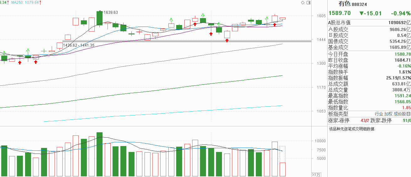 有色金属的朋友们,注意了!昨天高开高走中阳反弹,已经回到10月震荡的箱顶附近,下方5天线、10天线、20天线开始再度发散上行,从走势上明显有向上突破的信号,但今天受美股下跌影响出现大幅低开,随后探底5天线后回升,说明下方的承接力是足够的,即5天线如果企稳不了,10天线、20天线都可以再提供技术承接。但在刚要突破的时候出现这种节奏的打断,对投资人还是有影响的。我的观点与周初是一致,有色金属当前位置就在箱顶附近,而且5天线等均线对它是有支撑的,就算突破失败,只要不失守5天线形态还是偏多的,回撤幅度可控,但突破成功的话,上行空间被打开,能涨多高是不知道的,在风险、收益不成比例的情况下,今天虽然未能持续走强,但我还是继续看好,万一成功了这就是突破前的最佳进场机会,突破失败击穿5天线的亏损也能接受。