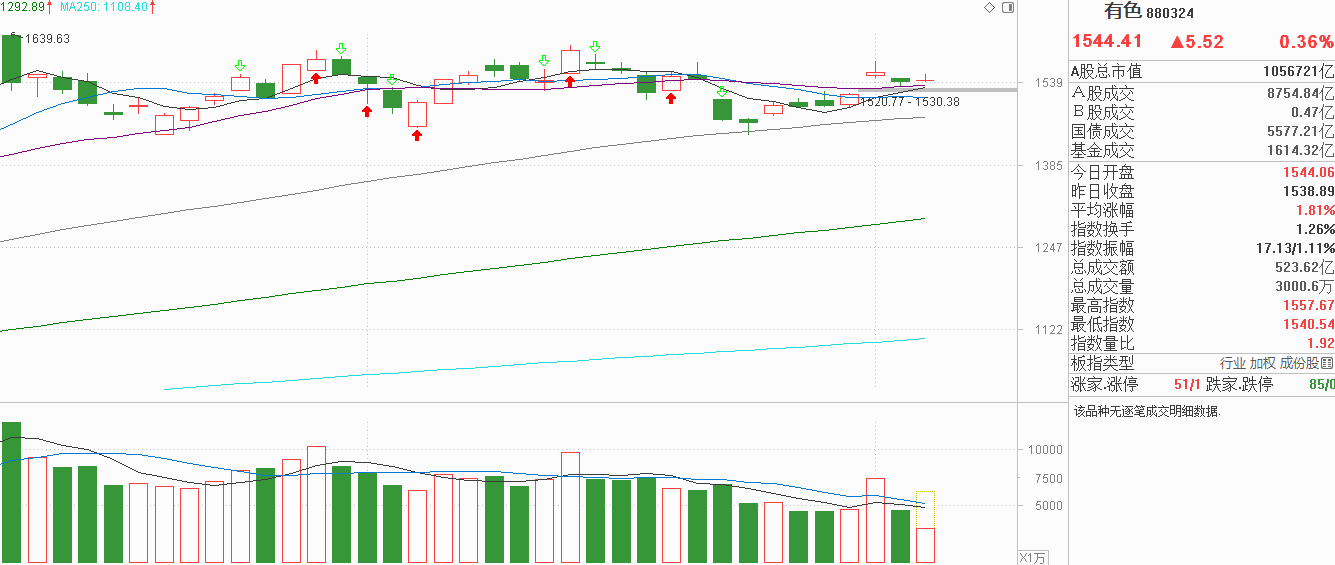 有色金属昨天低开探底20天线后回升,今天5天线上移准备上空20天线,对有色金属来说是一个承接位,只要没有筹码流出,有色金属要击穿20天线挺难。今天有色金属窄幅震荡很是奇怪,有点像岛型反转的镜像,即11月18号行情的反向。如果说有色金属现在是大箱体震荡,箱顶到达了应该要快速回落,毕竟获利盘执行的是高抛低吸策略,市场抛压相对较大,但我看到的是20天线即有支撑,还没有回踩5天线,算是比上一次行情要强,可是也没有看到有色金属向上突破的信号。由于本月有议息会议,是否降息对有色金属来说就是最大的不确定性,买预期卖现实有资金愿意在当前位置去押注,我觉得当前就在箱顶附近,短线别管这么多,到位了逢高止盈。如果降息真能落地形成突破10月9号高点,突破箱顶跟上主力一起看涨就行了。