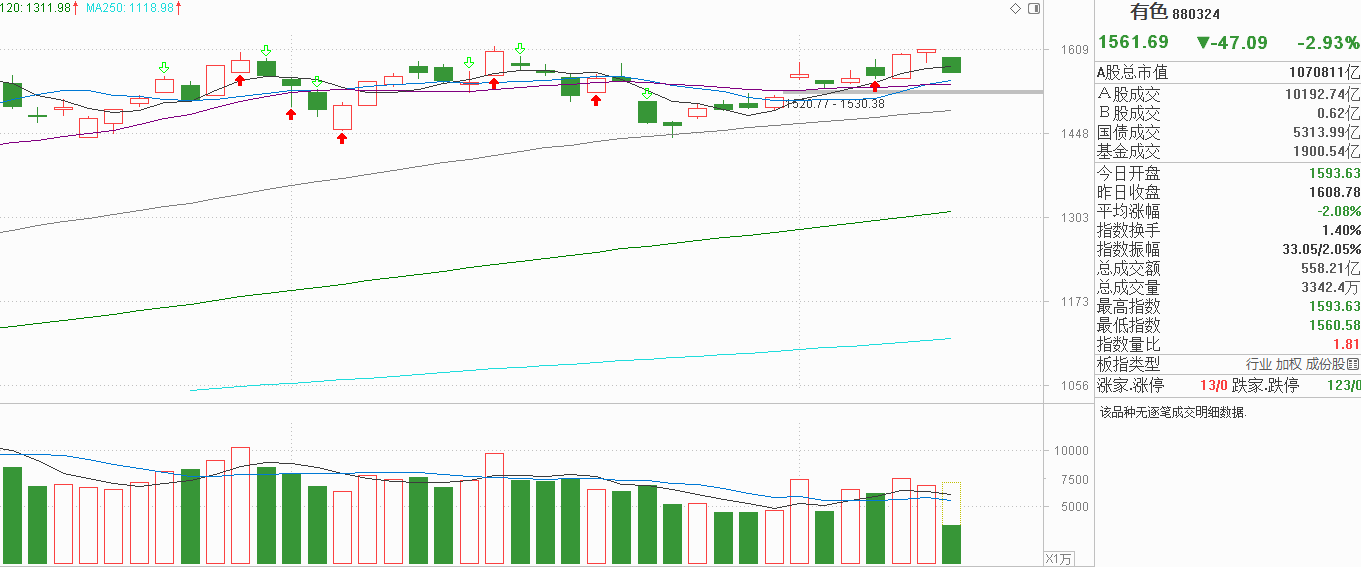 各位投资者朋友们,你们还记得有色金属昨天是啥表现吗?探底5天线后回升,位置与11月13号相近,依然是10月9号高点后的箱体震荡箱顶附近。由于此前三次尝试突破箱顶没有成功,昨天就认为要按箱体震荡处理,即箱顶止盈等待回落,或箱顶止盈等待突破后跟随。今天有色金属低开低走小阴调整回踩5天线,更像是走弱的可能,昨天认为的止盈没有问题。如果有色金属真要从箱顶回落至箱底,这个区间是比较大的必须提防,上一次60天线是有色金属的支撑区域,但第二次就没有支撑了,不能看到60天线上移离现在不远,就忽略市场本身存在的调整,原有箱体震荡规律很是明晰,该注意风险时就不能含糊。再说突破,今天是调整没有这个条件,追涨就更不可能实现了。
