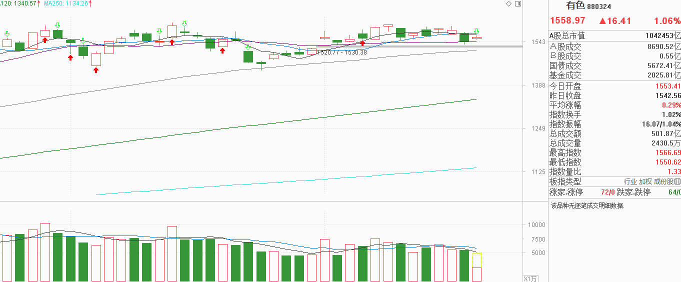 有色金属昨天中阴调整回踩20天线,当然是确认了此前关于10月9号高点箱顶的信号,有色金属第四次沿着5天线上行靠近箱顶还是以调整回落结束,所以箱体震荡的策略依然是有效的。有色金属10月后形成的箱底是10月22号或11月24号形成的低点,现在有色金属离开箱顶只是回踩20天线,并没有下行到位,从节奏上依然不是一个比较好的潜伏机会。今天有色突然高开高走中阳反弹基本把昨天阴线反包,走势当然是超预期 ,如果重新站上5天线,还可能出现第五次挑战箱顶的可能。但第五次与前四次的情况是一样的,必须突破了才是起飞的信号,突破不了还是会重新回落的。我的观点是只看箱顶与箱低,现在既然发现箱顶附近有阻力,就不要在刚刚回落的时候参与,真看好有色金属,应该在箱低附近潜伏,做好高抛低吸的准备。