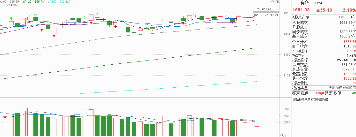 有色金属上周五小阳先是探底10天线消化上周四冲高回落的上影线,随后以小阳反弹完成修复,已经创了12月8号的新高,由于并没有上影线,实际上已经突破了10月9号形成的箱体顶部。从概率说能向上走高开启新的上涨空间。今天有色金属高开高走中阳反弹,由于上周五就在箱顶附近,今天的跳空缺口在技术上更像突破缺口,是明确的向上走强信号,即上周五可以看成存量震荡的箱顶逢高止盈,今天可以看成新箱体形成目前是箱底可以逢低看好,两者并不矛盾,上周以震荡市看待,本周就是上升行情或新箱体的形成。上周我认为这个试错成本是可以给主力的,既然有色金属选择了新方向,跟上主力继续看好我认为是最优的策略,今天的跳空缺口短期内应该不会被修复,5天线也会重新向上发散给予支撑。