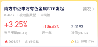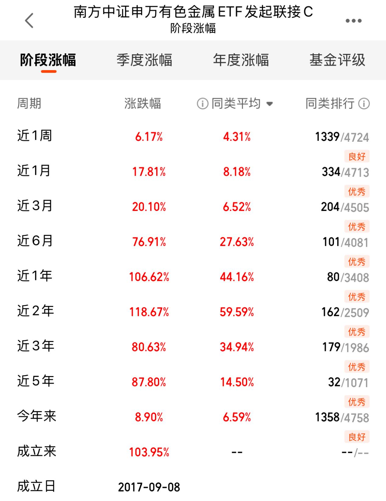 对于普通人来说,当前有色行情持续火爆,直接参与期货交易风险太高,借道基金布局其实是更稳妥的选择。而南方中证申万有色金属ETF发起联接C(004433)这只产品,确实值得重点关注。它紧密跟踪有色金属相关概念,选股灵活,能够精准把握板块的上涨机会,业绩表现也很突出。从具体业绩数据来看,这只基金近1周上涨6.17%,近1月上涨17.81%,近3月上涨20.10%,近6月上涨76.91%,近1年上涨106.62%,近2年上涨118.67%,成立以来更是上涨了103.95%,不管是短期还是中长期,都交出了不错的答卷,完全能跟上板块的上涨节奏。