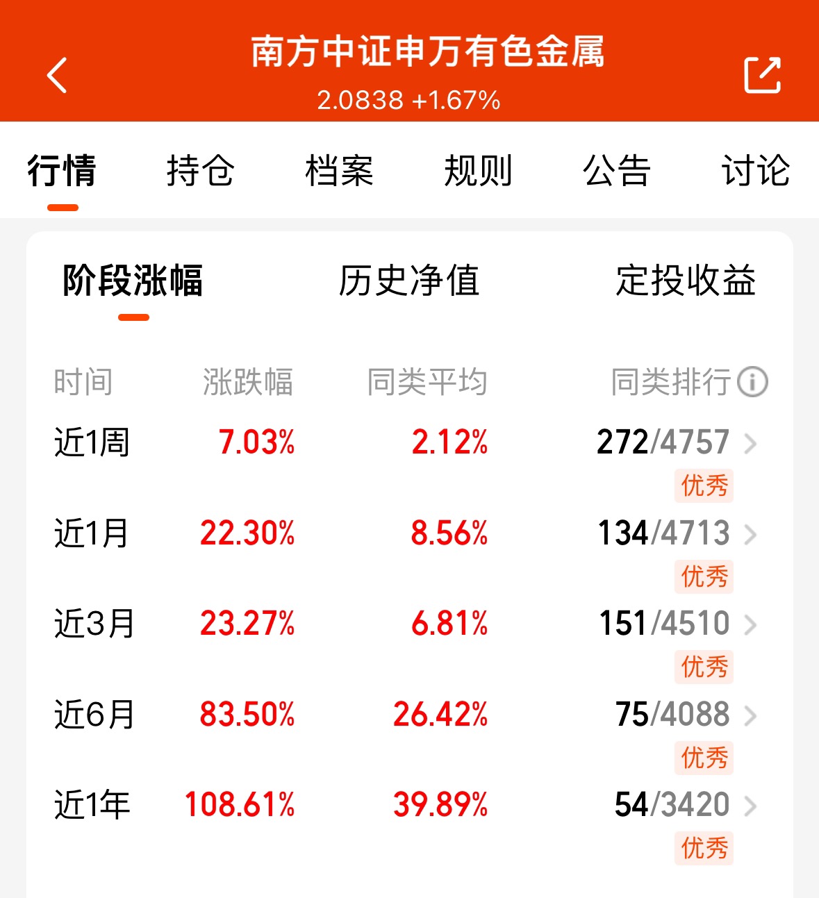 还有牛市里有色涨的猛,2026年的有色行情还是大有可为!南方有色,就是聚焦这个赛道的优质选择,一键布局行业红利,它近半年涨幅83.5%,近一年涨幅108.61%,大幅跑赢同类平均,各个时间周期的业绩表现都是优秀,我继续分批收集筹码!