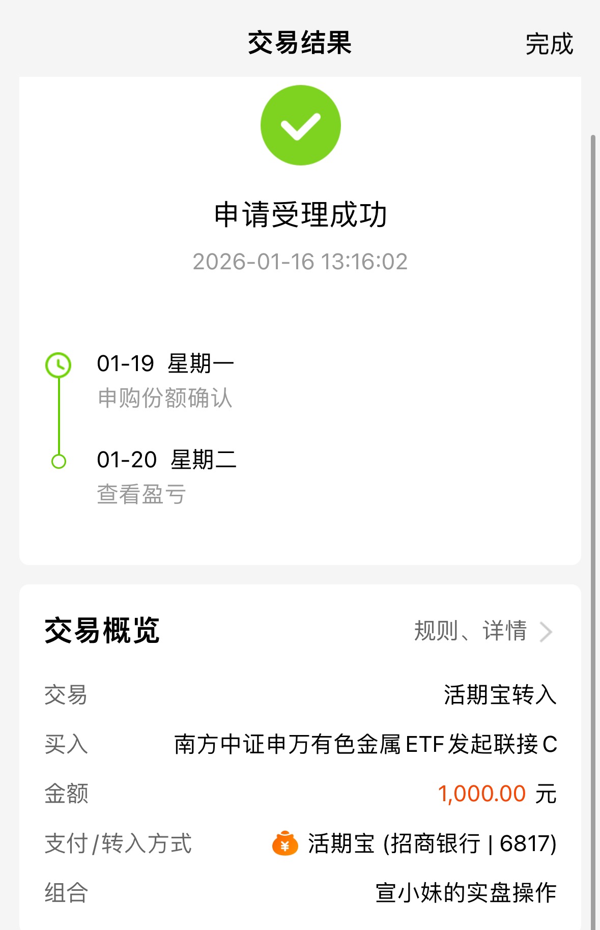 我今天再加一次1000元的$南方中证申万有色金属ETF发起联接C$ ,目前持仓3000元。