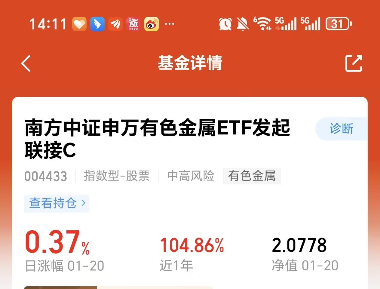 这是跟踪布局有色金属赛道的相关基金,今天盘中一度是涨幅超过2%,赚钱效应还算不错,并且拉长时间来看,近一年也是取得了104.86%的正收益,超额收益还是很强的。