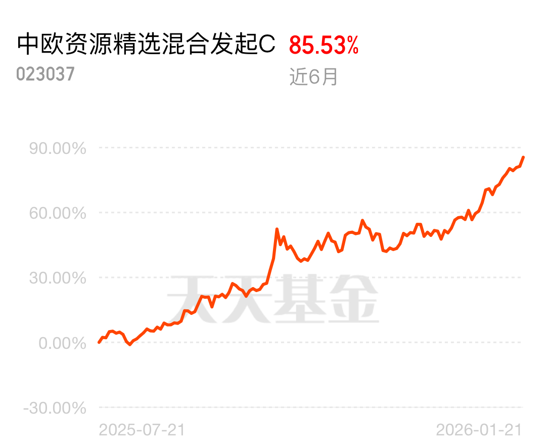 1 月 21 日国际金价直接突破历史,现货黄金飙到 4840 美元 / 盎司刷新纪录,日内涨了快 2%,COMEX 黄金期货也跟着创了新高,有色金属一直高景气,今天倒车接人别掉队,$中欧资源精选混合发起C$ 近 6 月 85.53%,资源行情稳稳抓