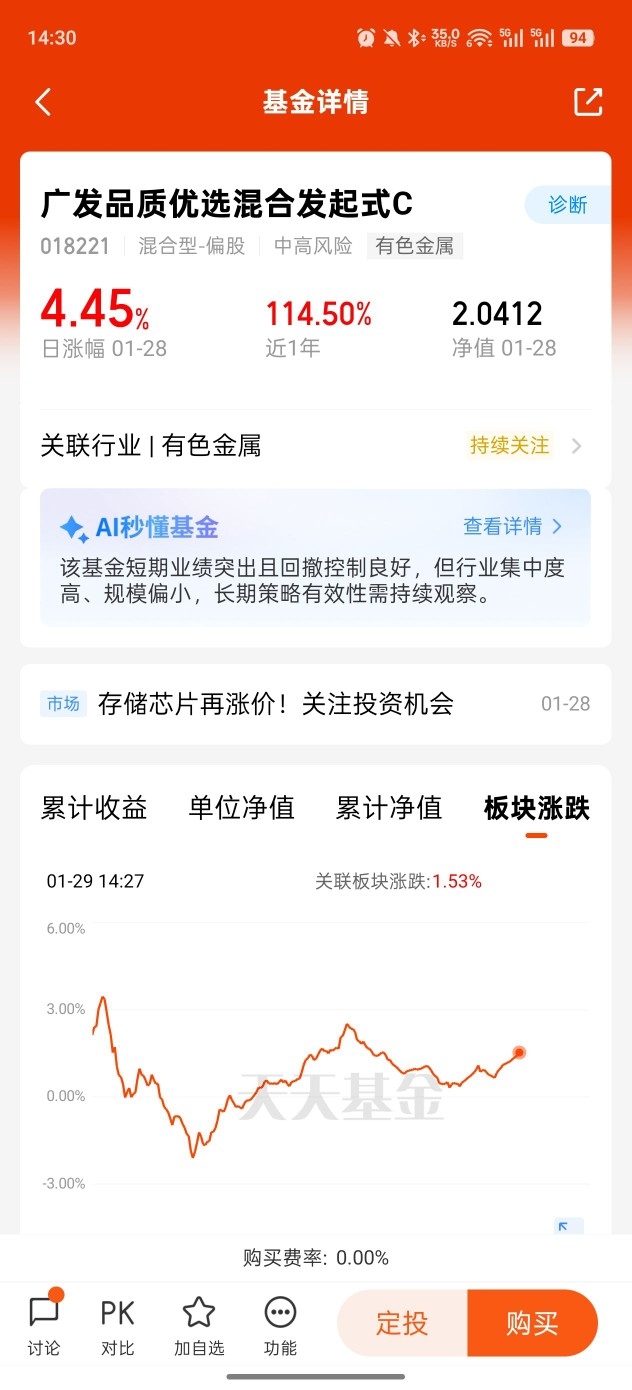 广发品质优选混合发起式C昨天大涨4.45%,今天还能涨,已经持有的,安心拿住,这种清晰的金银稀有资源驱动行情,往往具有持续性。波动是正常的,但逻辑没变就不用轻易下车。还在观望的,可以考虑分批布局。不要总想买在最低点,在趋势确立初期,用分批或定投的方式参与,是更务实的选择,看它近期的涨幅已经证明了捕捉机会的能力$广发品质优选混合发起式C$