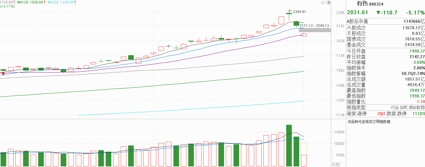 有色金属上周五大幅低开后单边下行,5天线明确失守,10天线还有支撑,但随着周末黄金白银出现历史性回撤后,有色金属明显受到影响大幅低开,低开位置在1月20号左右的平台位,现在出现高走回补第二个跳空缺口的情况。从技术上看,有色金属1月中旬形成了一个高位震荡平台目前是有支撑的,但大宗商品价格的波动目前不可控,并不排除依然有巨震的可能,即有色金属依然会受影响。我认为还是以业绩说话,但得在大宗商品的波动减弱后实施。如果本周贵金属波动无序,有色金属也有可能出现大起大落的可能,这是市场因素影响,非技术可以判断。我觉得这次急跌会有修复,但风险比较大,长周期趋势未变。