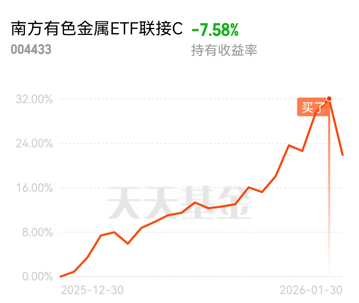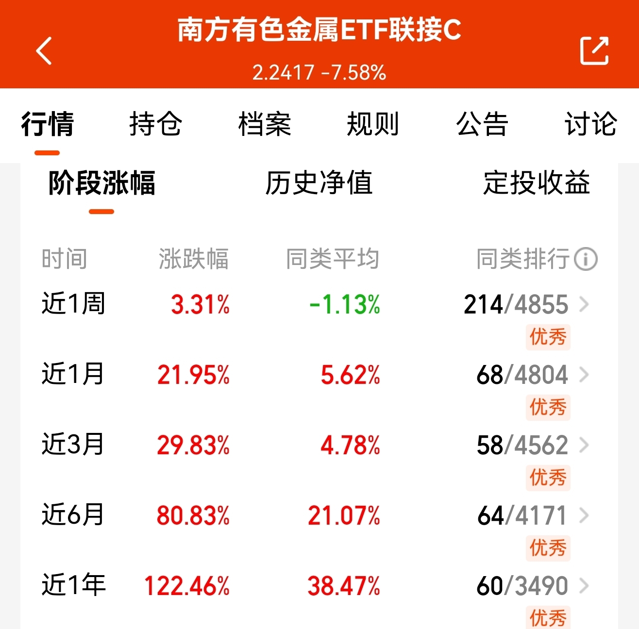 具体操作上,今天继续加仓$南方有色金属ETF联接C$ ,估值上目前较开盘已经收回来了不少,尾盘收红的概率比较大,短期趁着调整慢慢加进去;该基金历史业绩近一年涨了88.68%,近6月和近3月分别涨了80.83%和29.83%,每个阶段都表现的很强势,短期急跌是进场的好机会;$华安中证有色金属矿业主题指数发起式C$