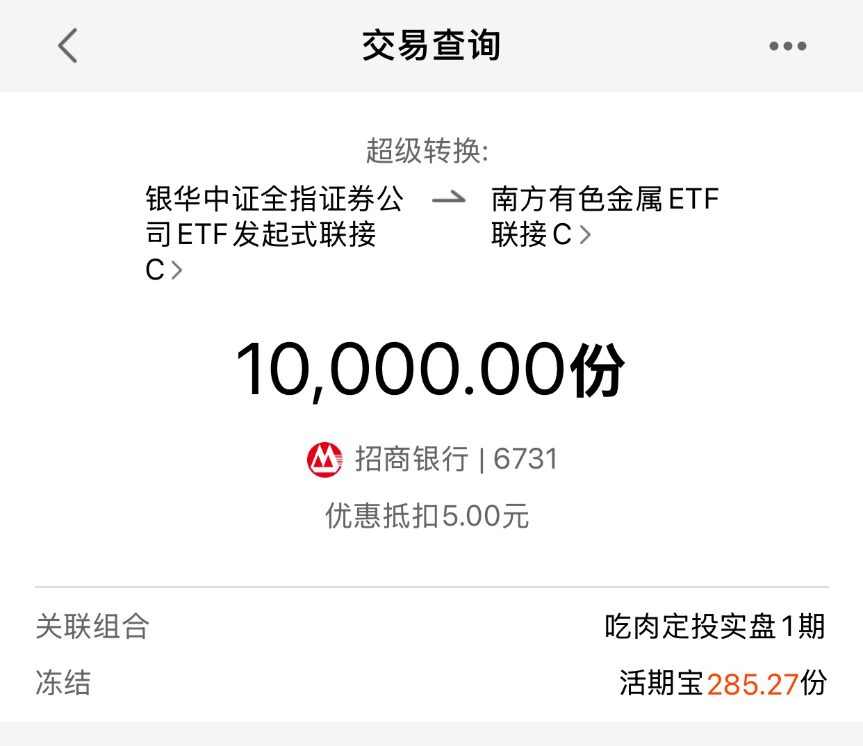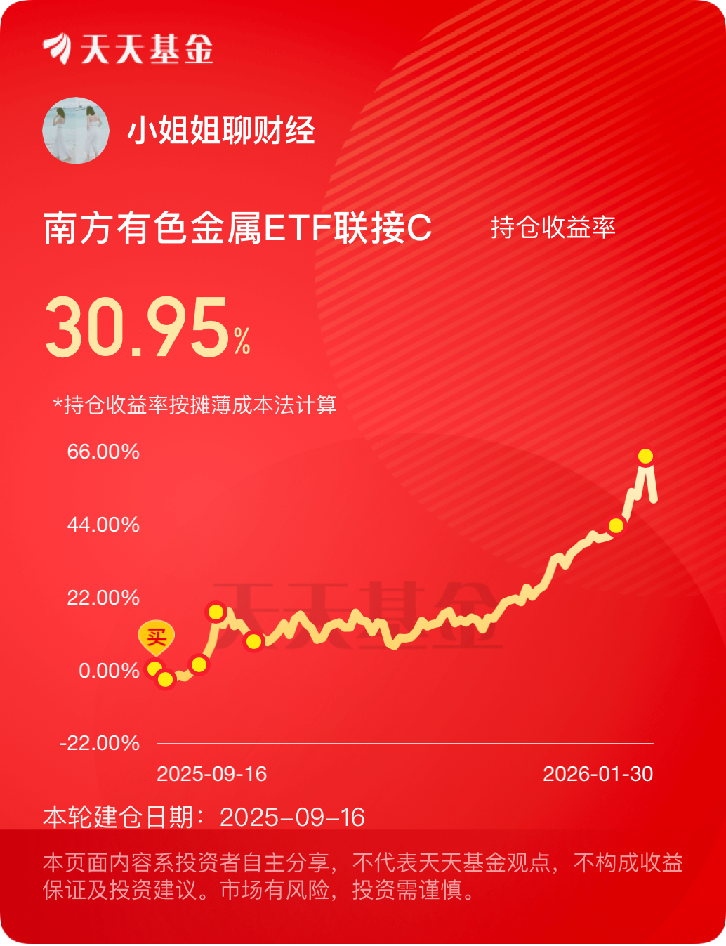 今日买入1万元南方有色金属(004433),$南方有色金属ETF联接C$ 有色资源板块今天还在跌,因为国际市场上周五晚上大跌,周一A股开盘属于跟跌,我们看国际金价,早盘已经上涨,目前因为亚洲市场的恐慌情绪蔓延,微跌,白银还是涨的,空头回补价格是在4500-4600美元,所以下跌空间有限,我继续趁着大家恐惧的时候提升仓位。保持有色为本轮牛市主线的观点不变。我也不建议大家手上的筹码割肉,就算闭着眼睛拿住也比割肉好。
