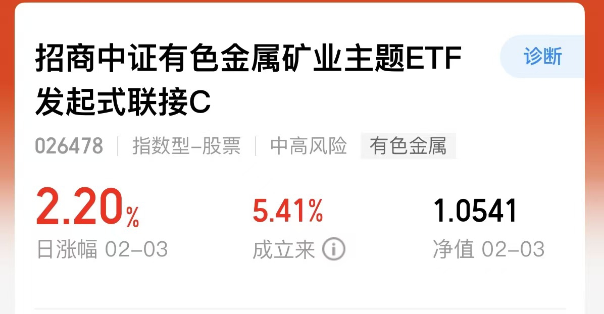 经过了前两天的洗盘之后,我看今天的市场已经开始慢慢回暖了,昨天夜盘金银上涨,有色也在逐步企稳,看来可以慢慢关注起来了。$招商中证有色金属矿业主题ETF发起式联接C$ 昨天上涨2.20%,还可以反弹力度挺强的。