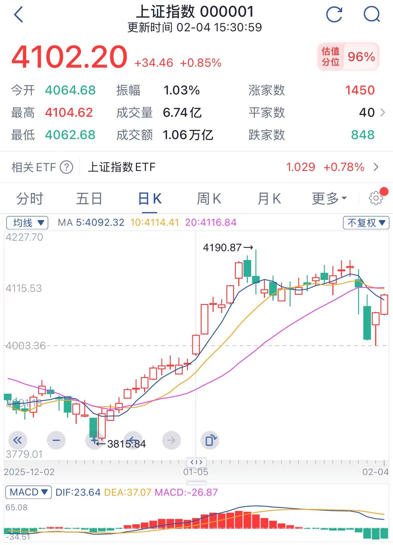 - 日线:探底回升收实体阳线,稳稳站上4100点整数关口,早盘下探4062点后快速反弹,说明4060点支撑坚如磐石,成交量1.06万亿保持高位,量价配合健康,MACD红柱持续放大,短期趋势继续走强,牛市慢牛格局明确!
