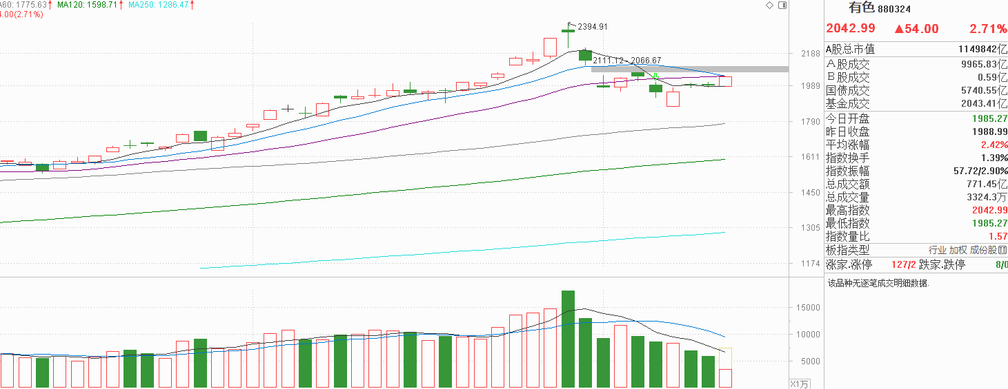 有色金属昨天窄幅震荡,5天线已经走平,已经维持了四天的重心不动,结合有色金属1月上涨后二月持续回调,我认为短周期抛压已经出清,1月平台在2月有效且进一步夯实。今天有色金属在5天线上方小阳反弹,力度不强未收复20天线,应该不是行情重启的表现,但看成高位箱体震荡是有可能的,毕竟昨天还在箱底附近,而且看到调不下去,考虑到有色金属短周期因连续下行技术出现乖离,重新上行修复是大概率事件。今天的小阳反弹就是技术修复的依据。根据有色金属当下表现,我认为再回到5天线依旧是潜伏机会,像今天这样突然启动反而不是追涨的周期,如果有色金属能站上20天线震荡向上,箱体博弈周期才会开始,就算是20天线上方才看好,至箱顶的空间也很大,寻找确定性后再跟随也不迟。