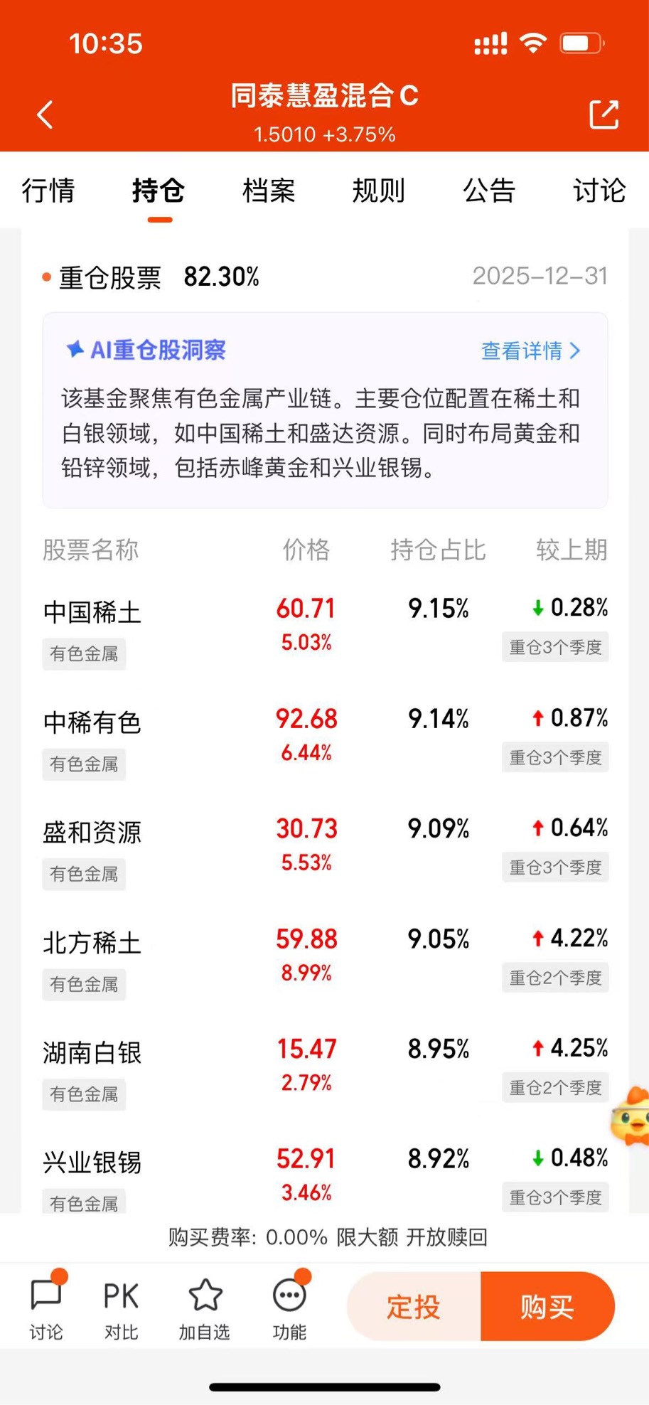 专注稀土领域布局,覆盖行业优质龙头,稀土相关资产占比超36%,坚持基本面投资,各周期业绩稳健可靠。