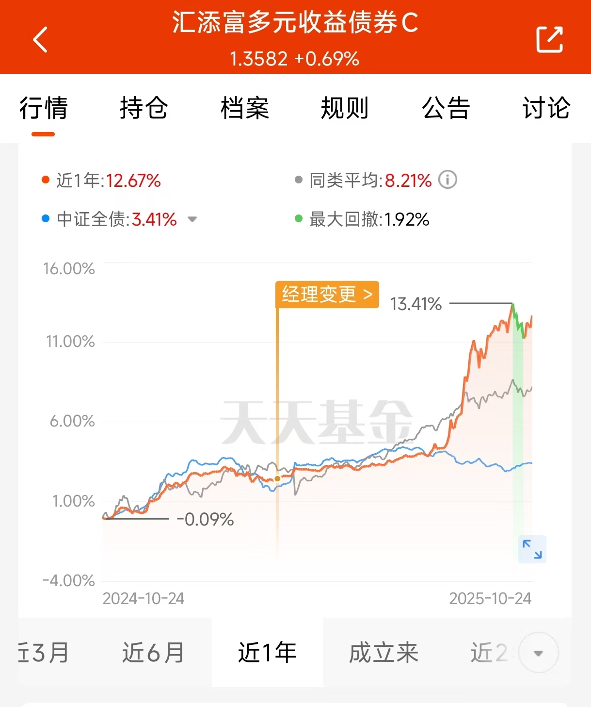 看看这市场,说不好哪天就来个回调,全仓冲进去需要太大勇气。但要是完全空仓看着别人赚钱,那滋味更难受。我研究了一下,像$汇添富多元收益债券C$(470011)这种基金,简直就是为我们这种又想参与又怕波动的人设计的。它有个灵活的地方,就是投资于权益方面的比例可以在0到20%之间动态调整,市场好的时候能多参与一点,感觉风向不对就能降下来,重点控制回撤。最近它不是表现挺亮眼嘛,属于稳中求进的类型。对于我们普通投资者来说,这种能攻能守的产品,拿着心态会好很多。#美方“不再考虑”对中国加征100%的关税#