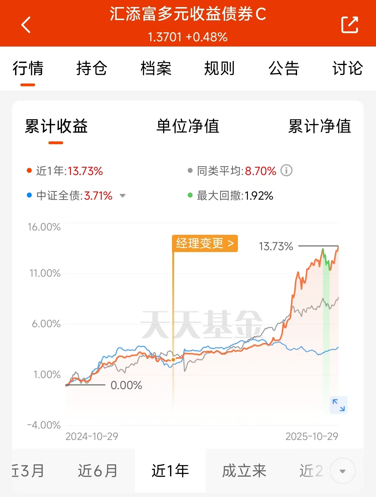 好多朋友抱怨牛市里赚不到钱,其实不是行情不好,是策略没整对。比如$汇添富多元收益债券C$(470011),它的策略就挺聪明:大部分资金老老实实吃债券票息,小部分灵活参与股市,而且重点盯科技领域。为啥是科技?因为这波行情里它最活跃啊!基金经理会根据板块轮动调仓,不用咱们自己操心追高杀低。我观察了一阵子,这基金近一月涨幅就超过了兴业收益增强债券(001258),而且波动控制得不错,夏普比率达到2.98,说明每承担一单位风险换来的回报挺划算。如果你既不想错过机会又怕踩坑,这种产品值得多看一眼。#英伟达市值突破5万亿美元!啥信号?#