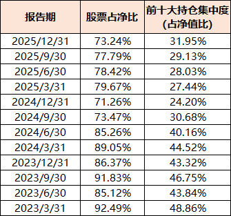 从2024Q3以来,前海开源多策略混合的股票仓位持续维持在7成左右,且前十大重仓股集中度相较以往有多下降,多在30%左右。
