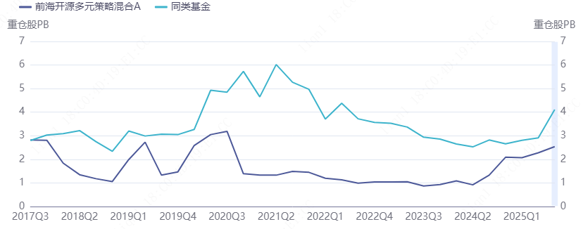 前十大重仓股的PB持续低于同类基金,也就是说该基金是在低估值的行业及个股中寻找机会。