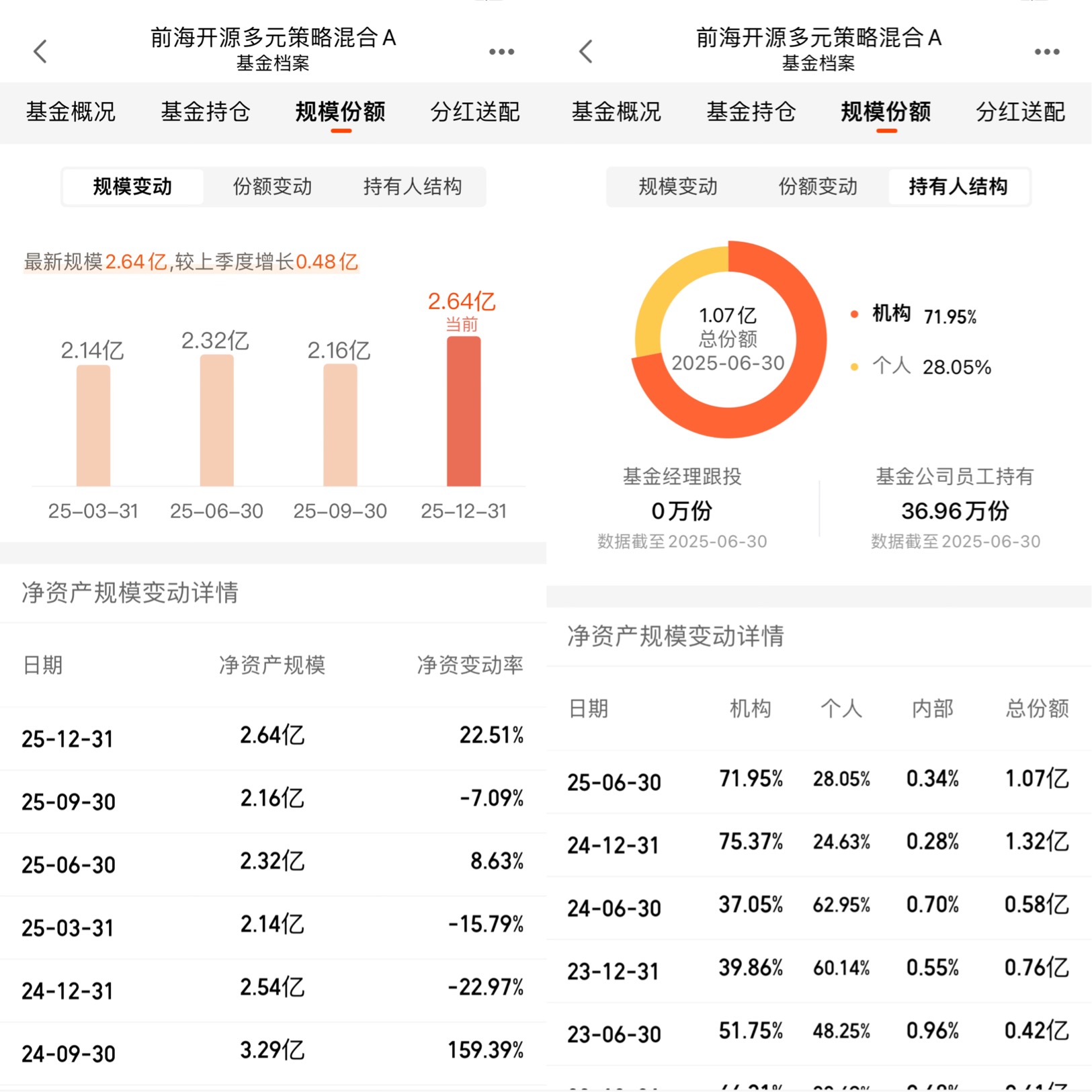机构投资者的动向往往是判断基金质量的重要参考,前海开源多元策略混合A的机构持有比例高达71.95%,而个人投资者仅占28.05%。这种“机构主导”的持有人结构,说明它得到了专业投资者的广泛认可。机构投资者通常具备更深入的研究能力和更严格的风控标准,他们的长期持有,相当于为这只基金的质量提供了“背书”。从规模变化来看,基金最新规模2.64亿元,较上季度增长22.51%,显示出资金正在持续流入。值得注意的是,它的规模始终保持在3亿元以下,这种“小而美”的体量让基金经理更容易调仓换股,不会因为规模过大而影响操作灵活性。相比那些动辄百亿的“巨无霸”基金,这种中小规模产品往往能在行情切换时更快反应,获取超额收益。