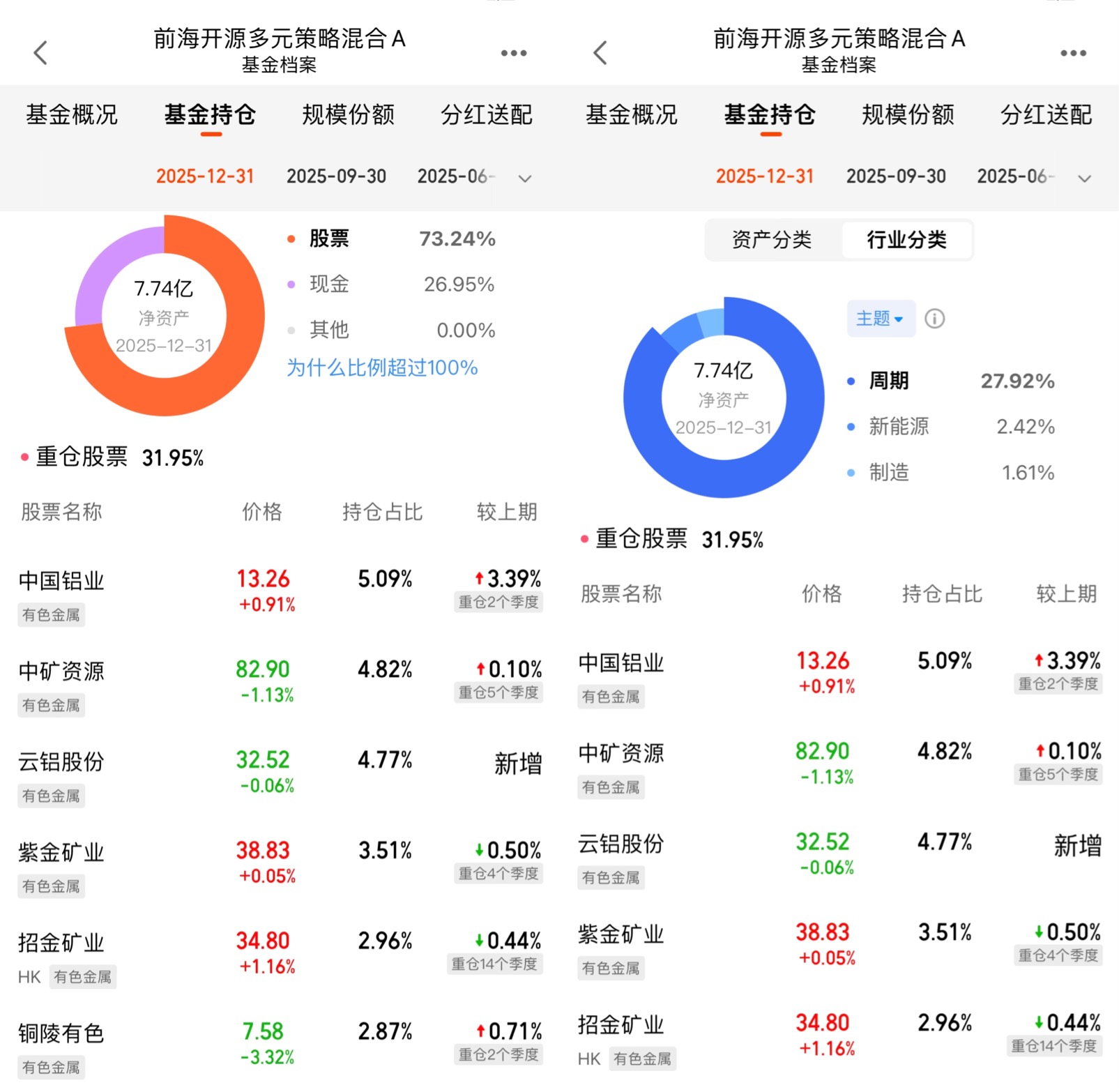 很多人看到“多元策略”这四个字可能会觉得抽象,但深入了解后就会发现,这恰恰是这只基金的核心优势。它的投资框架可以概括为“全情景配置+多因子模型+动态调整”:首先通过宏观经济分析确定股票、债券、现金等大类资产的比例,再用量化模型筛选优质个股,最后根据市场变化实时调整仓位。从最新持仓数据看,股票仓位73.24%,现金26.95%,既保留了进攻性,又预留了足够的安全垫。这种策略的好处在2024年下半年的行情中体现得淋漓尽致。当时有色金属板块出现阶段性回调,基金经理及时降低了有色仓位,同时增加了红利资产的配置,成功规避了后续的深度调整。而当2025年初有色板块反弹时,又迅速加仓抓住机会。这种灵活应变的能力,比单纯押注某一行业的基金稳健得多。