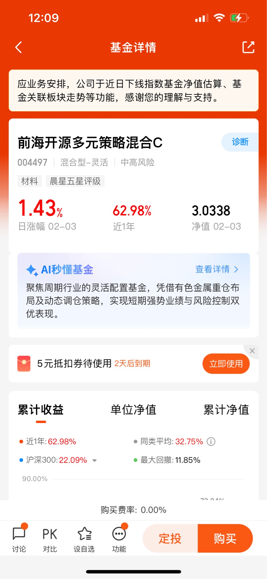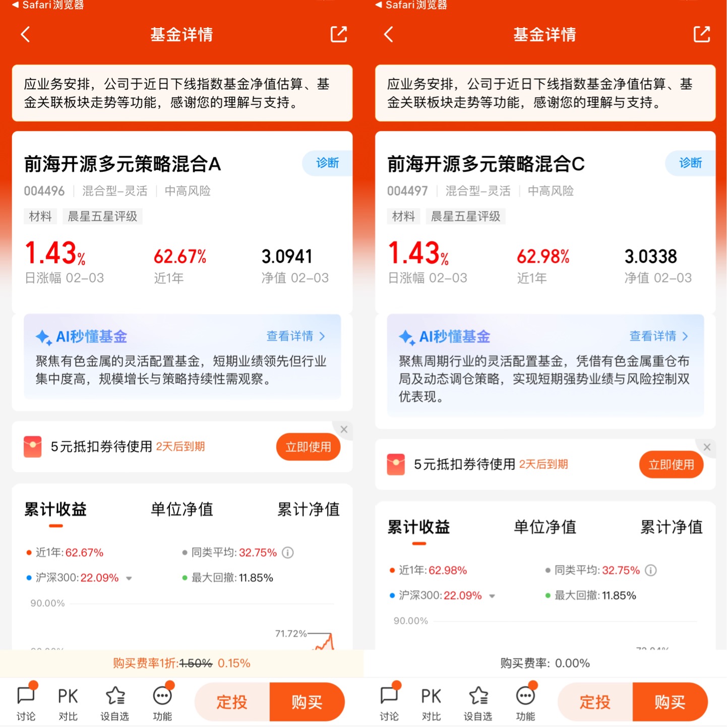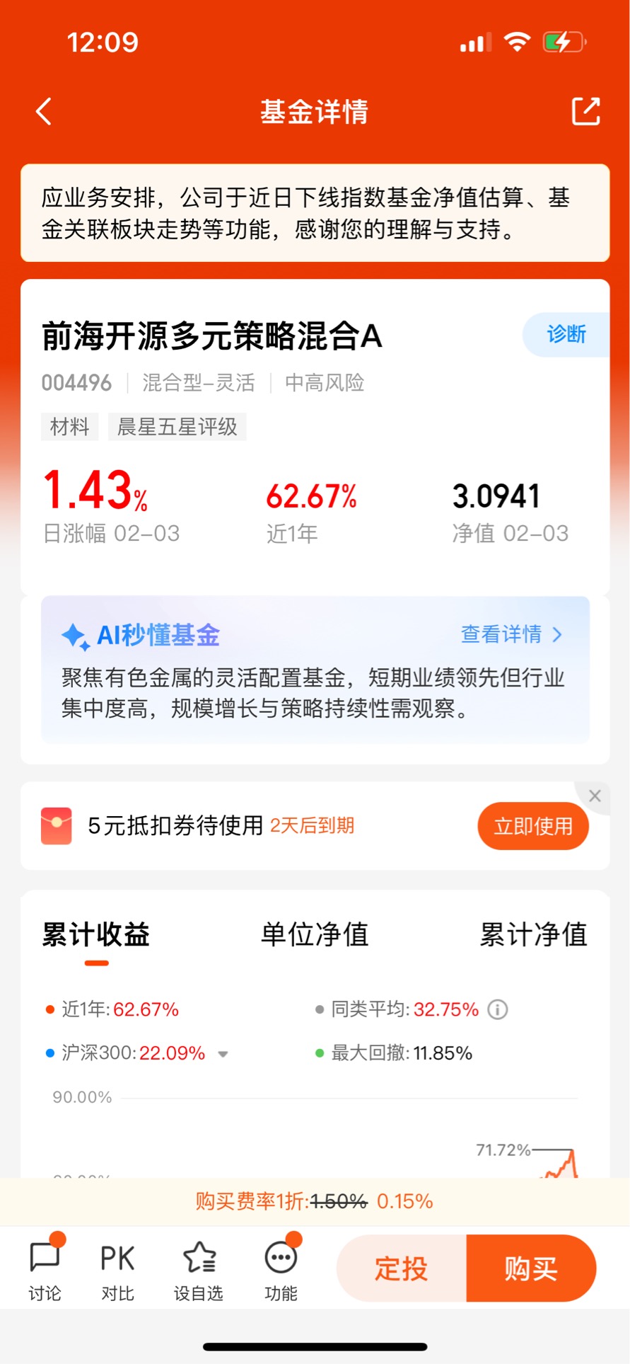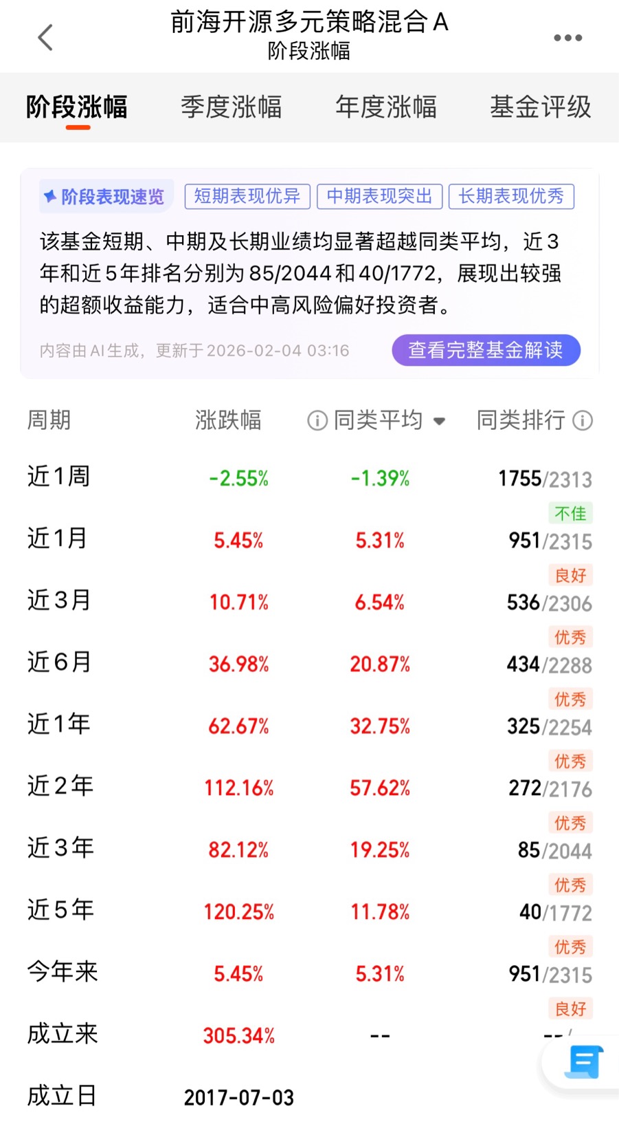 评价一只基金的核心标准永远是业绩,前海开源多元策略混合A的表现用“惊艳”来形容毫不为过。先看短期,近一年62.67%的收益率直接碾压同类平均32.75%的水平,在2254只同类基金中排名325位,前15%的成绩足够亮眼。再拉长时间维度,近三年累计收益82.12%,是同类平均19.25%的四倍还多;近五年收益120.25%,而同期同类产品仅为11.78%,差距一目了然。更难得的是,它成立以来累计收益已达305.34%,年化回报超过15%,这样的长期收益能力在主动管理型基金中堪称佼佼者。我特意对比了它在不同市场环境下的表现:2022年A股深度调整时,沪深300指数全年下跌21.63%,而这只基金仅回撤24.01%,远好于同类产品46.98%的平均回撤;2023年市场震荡反弹时,它又能抓住有色金属板块的行情,取得远超指数的收益。这种“涨得比别人多、跌得比别人少”的韧性,正是长期投资最需要的品质。