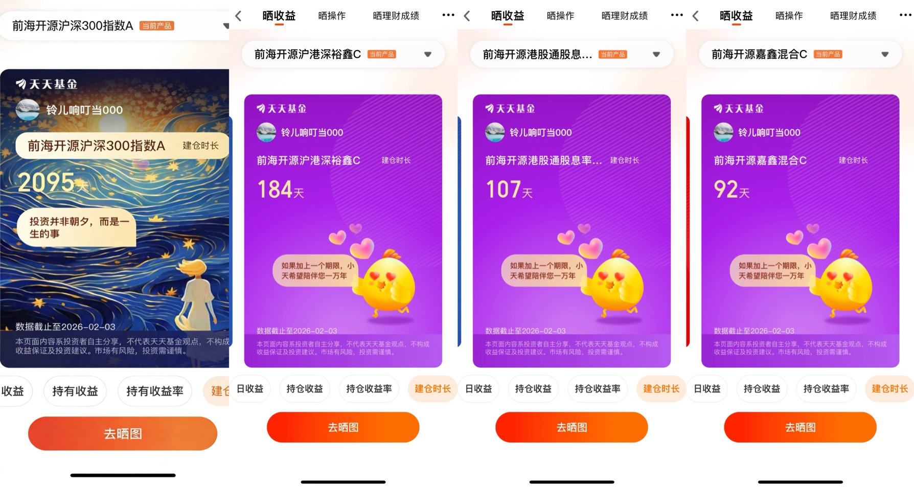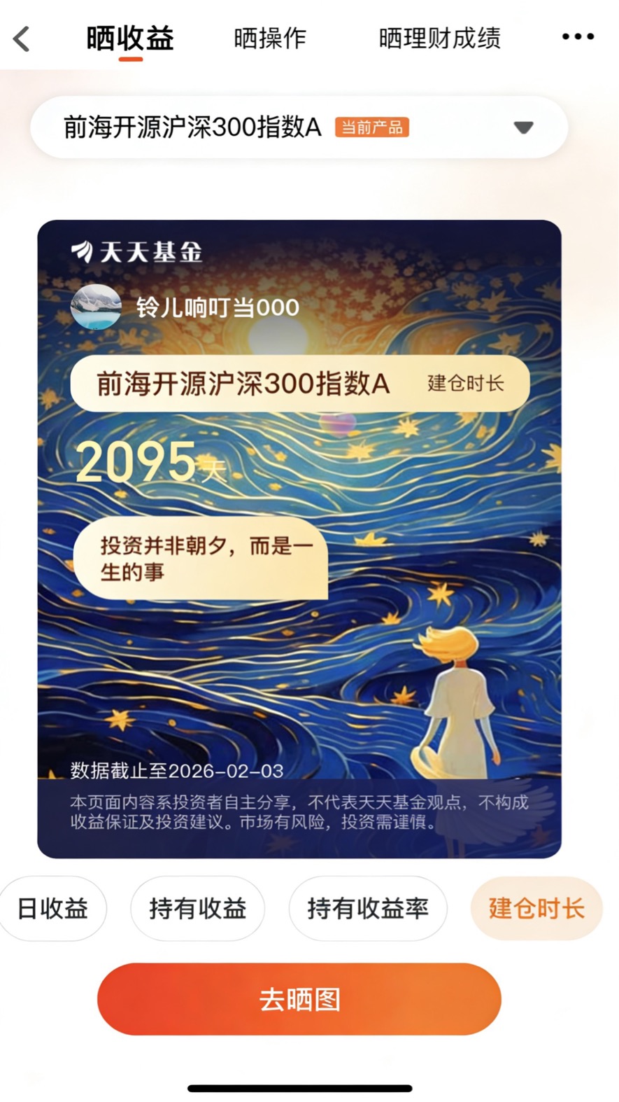 看着账户里“2095天”的持有记录,我越来越觉得投资就像一场马拉松,不在于起跑时的爆发力,而在于能否匀速跑到终点。长期投资的意义,从来不是追求一夜暴富,而是用时间熨平市场波动,让资产随着经济增长稳步增值。它给普通人提供了一条不需要专业技能、只需要耐心就能参与经济发展的路径,尤其适合像我这样没有时间盯盘、也不懂复杂技术分析的上班族。未来我还会继续持有这只基金,也许是下一个五年,也许是十年,我相信只要中国经济在向前走,这些核心企业在创造价值,我的耐心就会得到回报。毕竟,投资最终是为了给家人一份更安稳的未来,这才是长期投资最温暖的底色。