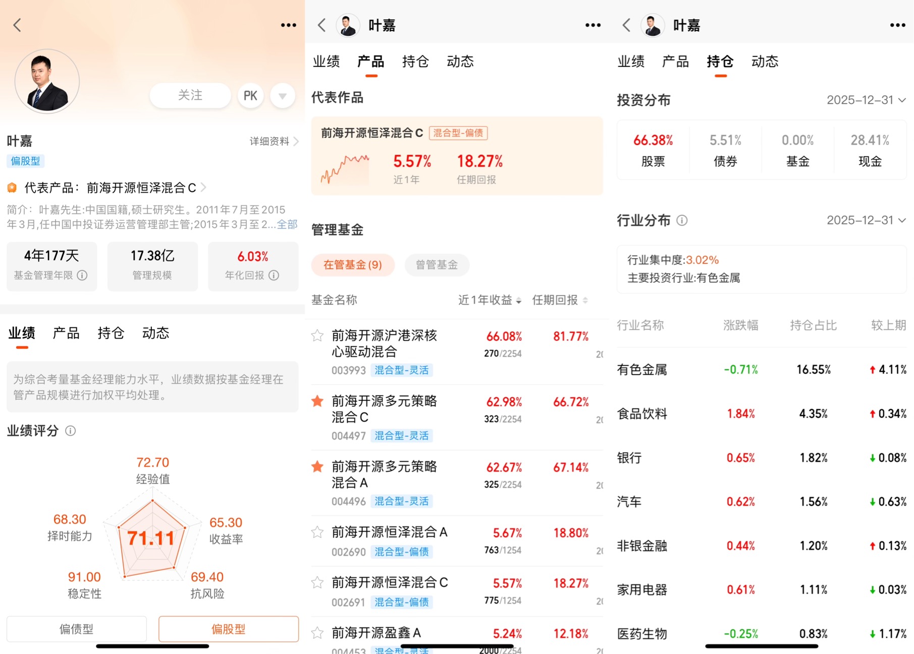 基金的本质是“选人”,前海开源多元策略混合A的基金经理叶嘉,正是我看好这只产品的重要原因。叶嘉拥有超过5年的基金管理经验,是特许金融分析师(CFA)持证人,擅长从宏观视角挖掘周期行业的投资机会。他在2021年接管这只基金后,迅速完成了从有色到红利的仓位切换,精准踩中了几轮周期行情,任职回报高达67.14%,年化收益超过13%。我研究过叶嘉的其他在管产品,发现他管理的前海开源沪港深核心驱动混合近一年收益66.08%,同样以周期股为主要配置,这说明他的投资框架具备很强的一致性和可复制性。更重要的是,他的换手率控制在合理水平,近三年换手率83.63%,远低于同类基金的平均水平,显示出他对持仓个股的信心和长期持有理念。