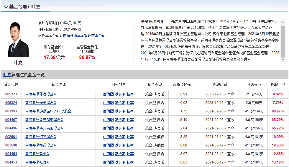 执掌这只基金的叶嘉经理,有着券商和基金公司的多重从业经历,从2021年开始管理前海开源多元策略混合A,经历过市场的多次震荡考验。他的操作风格很务实,仓位管理灵活,能根据市场情况调整持仓比例,既不会过度激进,也不会错失机会,而且他管理的5只基金近一年均实现正收益,这份实操成绩足以让人放心。