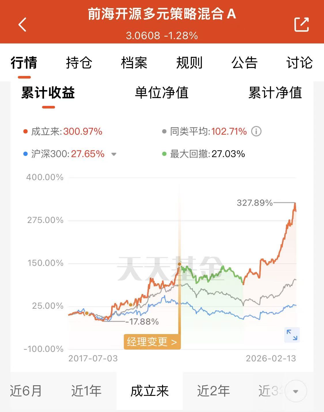 1、业绩表现亮眼:自2017年7月3日成立以来,面对在此期间大幅震荡的A股(上证指数波动范围达到2600~4100点,波动幅度超过50%),一直保持着非常稳健的投资回报。前海开源多元策略混合A(004496)“成立以来”的阶段涨幅最高达到327.89%,虽然近日有所回调,依然高达300.97%,远超同期沪深300指数的27.65%;“近5年”夏普比率达到0.82,“性价比很高,优于96%同类”。