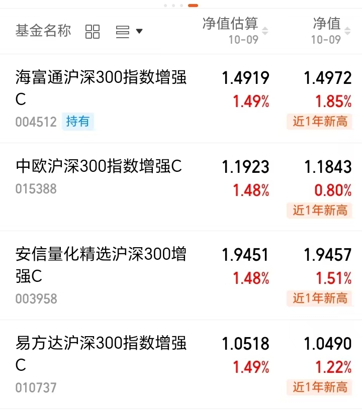今天A股市场高开高走,节后开门红呢!沪指突破3900!沪深300指数上涨1.48%,表现不错。不过我更喜欢增强策略获额外收益加成的。像$海富通沪深300指数增强C(OTCFUND|004512)$今天上涨1.85%,跑赢沪深300指数0.37%,这个超额收益真心不错呢。看下其他的净值更新表现: