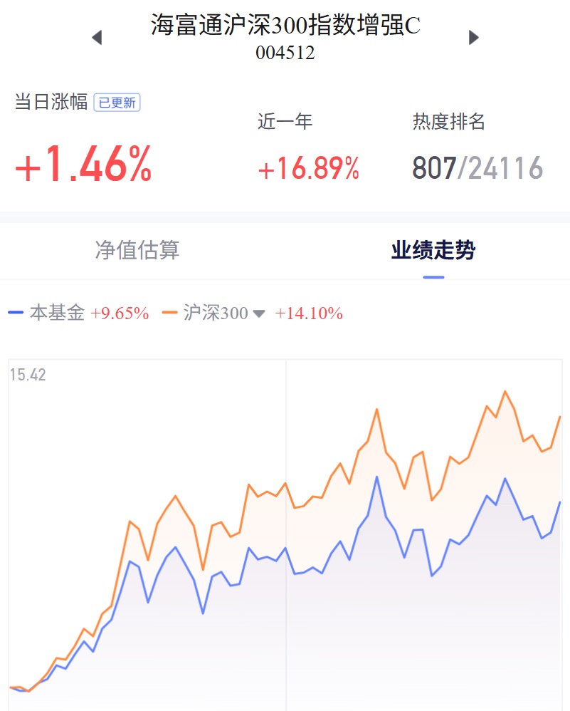 海富通沪深300增强C今日上涨1.46%,紧跟沪深300指数走势,精选核心标的发力拉动收益。近期市场整体震荡,该基金通过增强策略把握结构性机会,体现出良好的择时和选股能力,短期表现稳健,长期潜力可期。