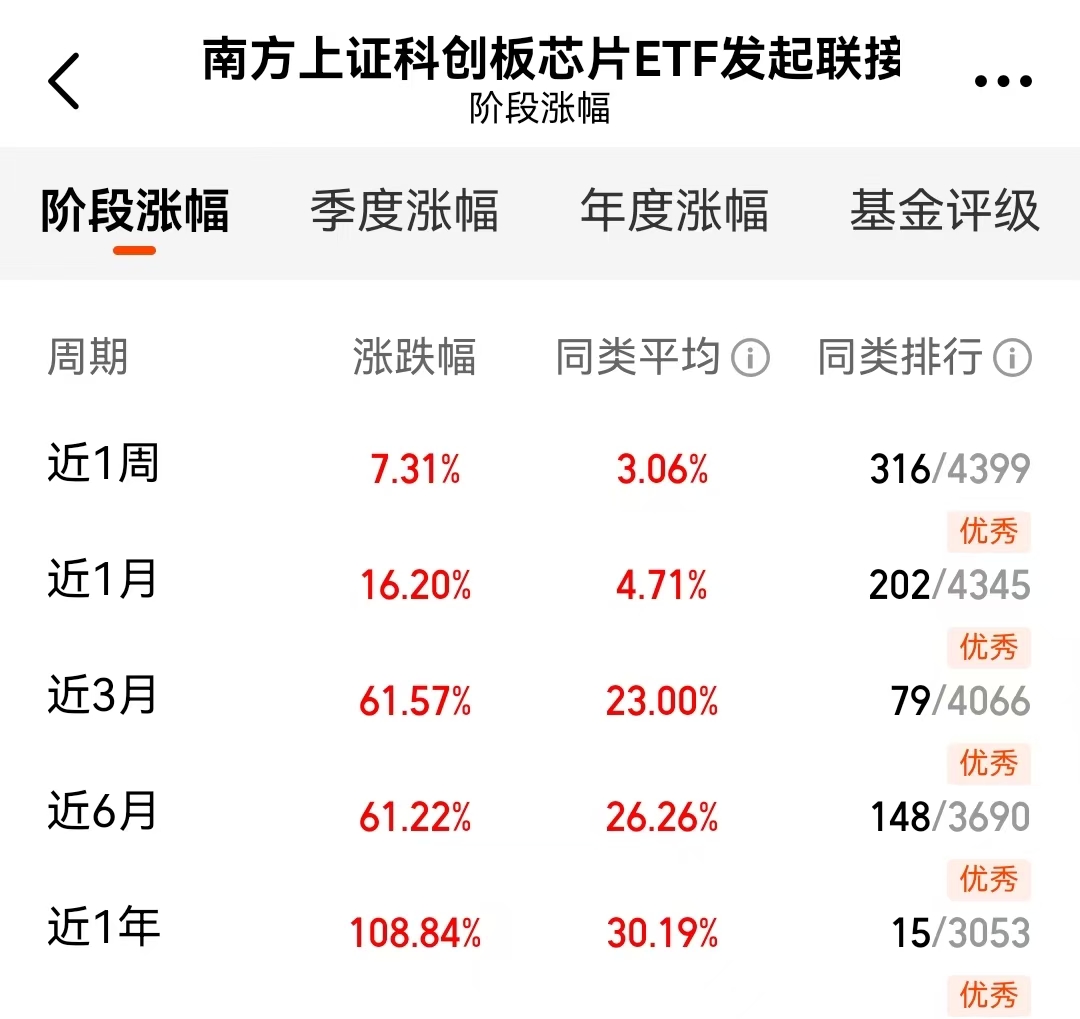 这基金$南方上证科创板芯片ETF发起联接A$(021607)近三个月的表现是增长61%,同类排名第一;近一年表现是增长108%,同类排名第一。它的投资目标是紧密跟踪科创板芯片指数。当前阶段,芯片技术在多个领域都有广泛的应用和需求,产业发展受到关注。投资于这样的指数基金,可以为希望参与芯片行业发展的人提供一个工具,其波动可能比投资单一股票相对平缓一些。#国际金价史上首次升破4000美元大关#