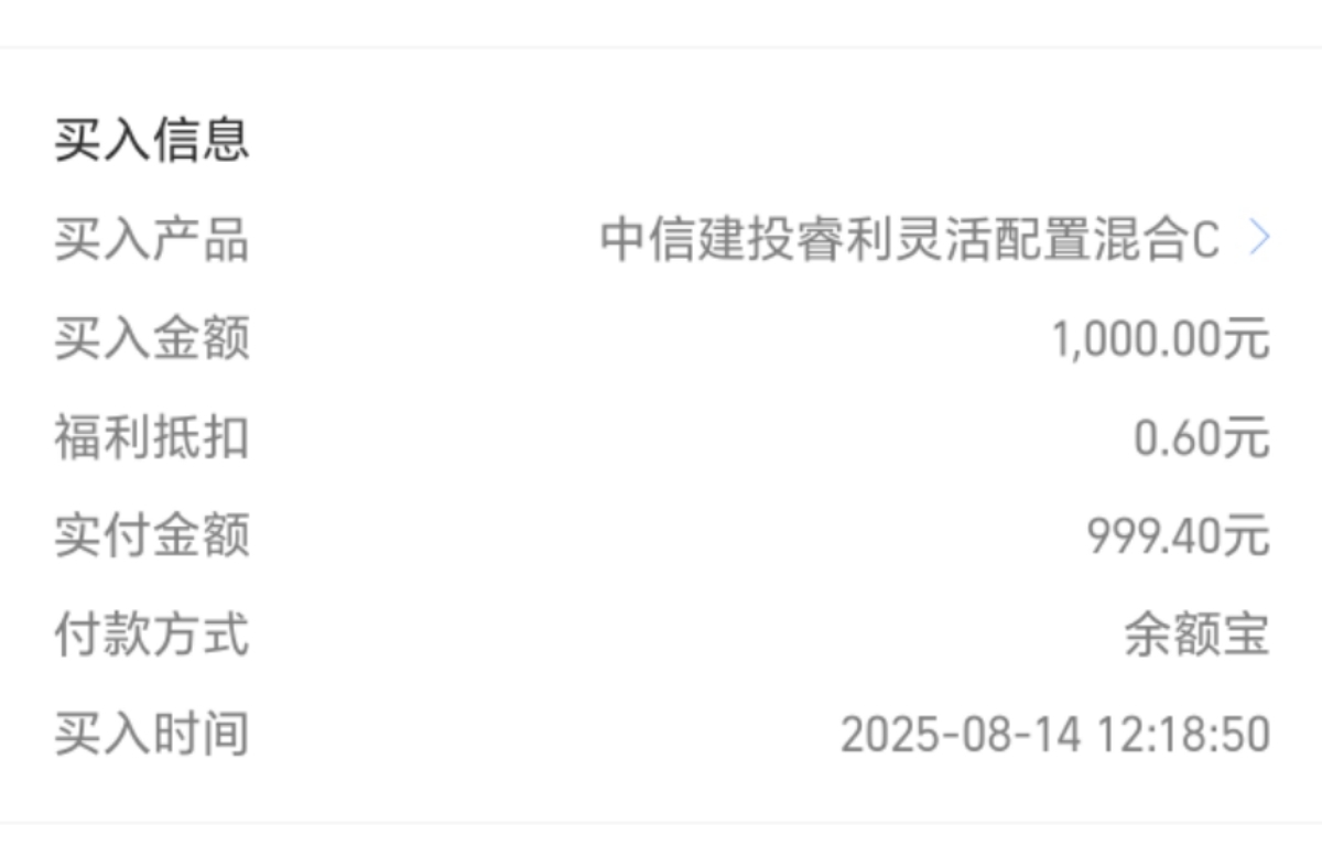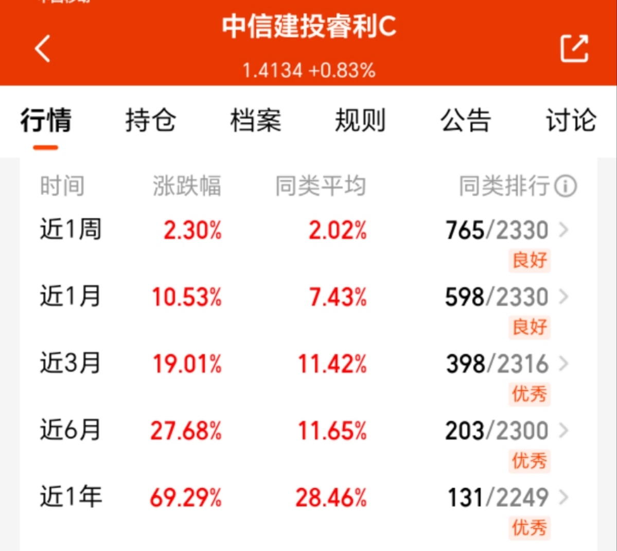 最近股市行情相当不错,给了我不少信心!今天我入手了$中信建投睿利C$ 1000元,该基金昨天上涨了0.83%,近半年涨幅达到27.68% ,近一年收益率更是高达69.29% ,今年以来轻松跑赢中证1000和国证2000,爆发力非常强,长期业绩大幅领先业绩基准,表现十分亮眼。#A股冲击3700点# #八月基金投资策略#