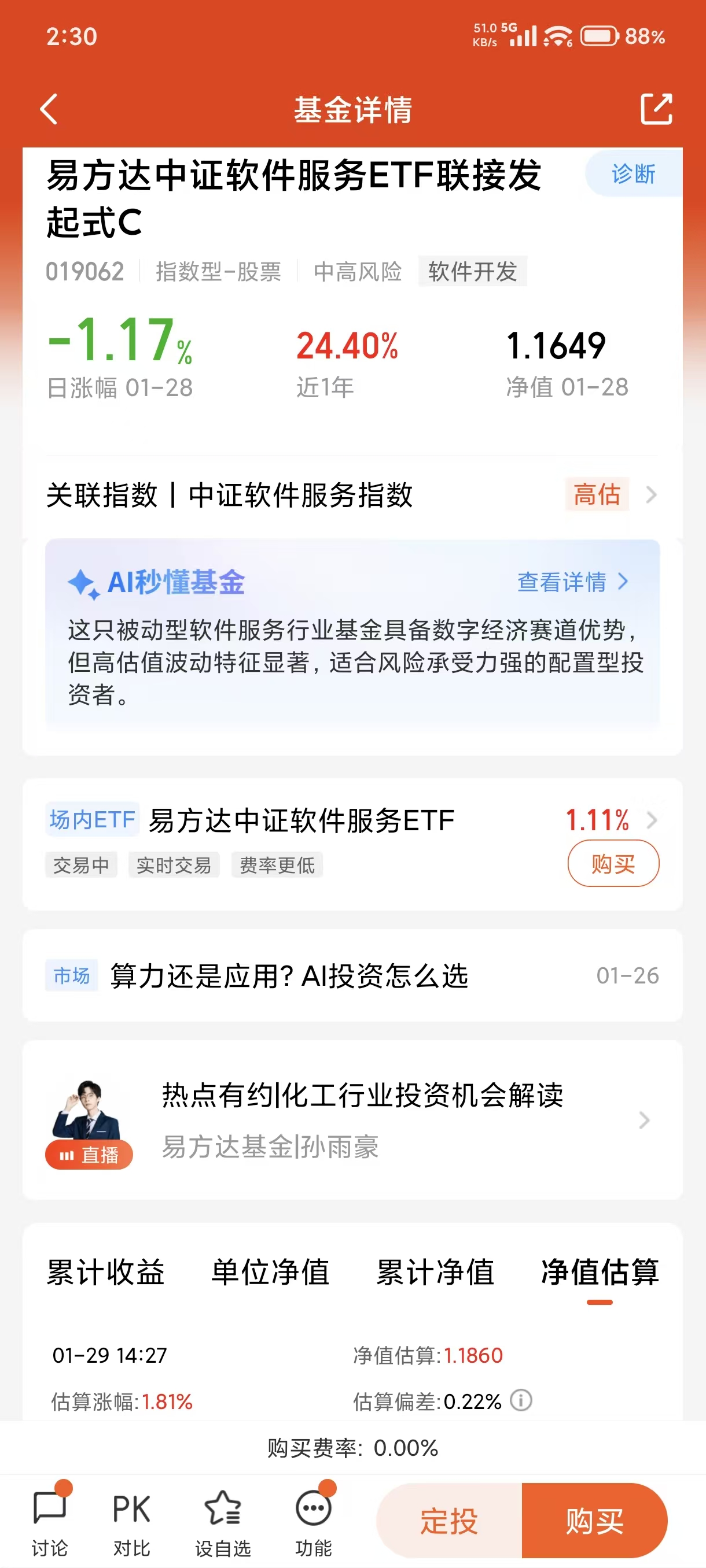 易方达中证软件服务ETF联接发起式C(019062)跟踪中证软件服务指数,覆盖软件开发、IT服务、信息化应用等领域,前十大重仓股包括科大讯飞、金山办公、恒生电子、三六零等。未来随着人工智能AI的持续发展,这只基金有望迎来大爆发。我后续会持续加厚仓位,长期看好这只基金的表现。$易方达中证软件服务ETF联接发起式C(OTCFUND|019062)$