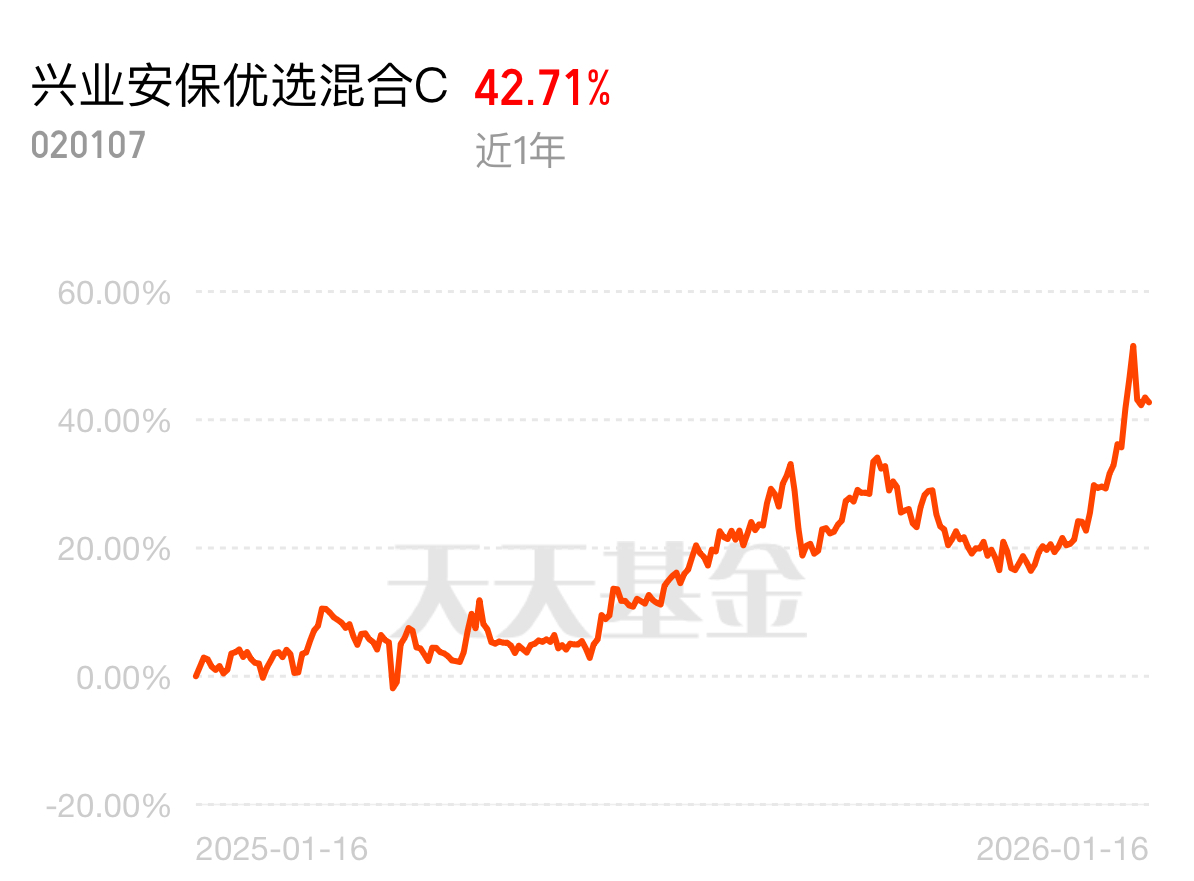 A 股波动率下降,长期持有胜率提升,兴业安保优选混合 C 适合拿住,近 1 年 42.71% 收益领跑,隔壁安保今天又跑第一,主动管理穿越波动,长期更赚钱。$兴业安保优选混合C$
