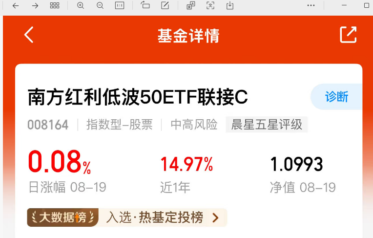 行情回暖,但市场总有起伏。$南方红利低波50ETF联接C$(008164)近5年收益76.94%,靠的不是短期炒作,而是长期持有优质企业。它的持仓企业大多分红稳定,波动较低,在市场震荡时反而更具吸引力。结构性行情里,资金会自然流向确定性更高的方向,而这类策略恰好能在波动中提供缓冲。回调不是风险,反而是优化持仓的机会。#八月基金投资策略#