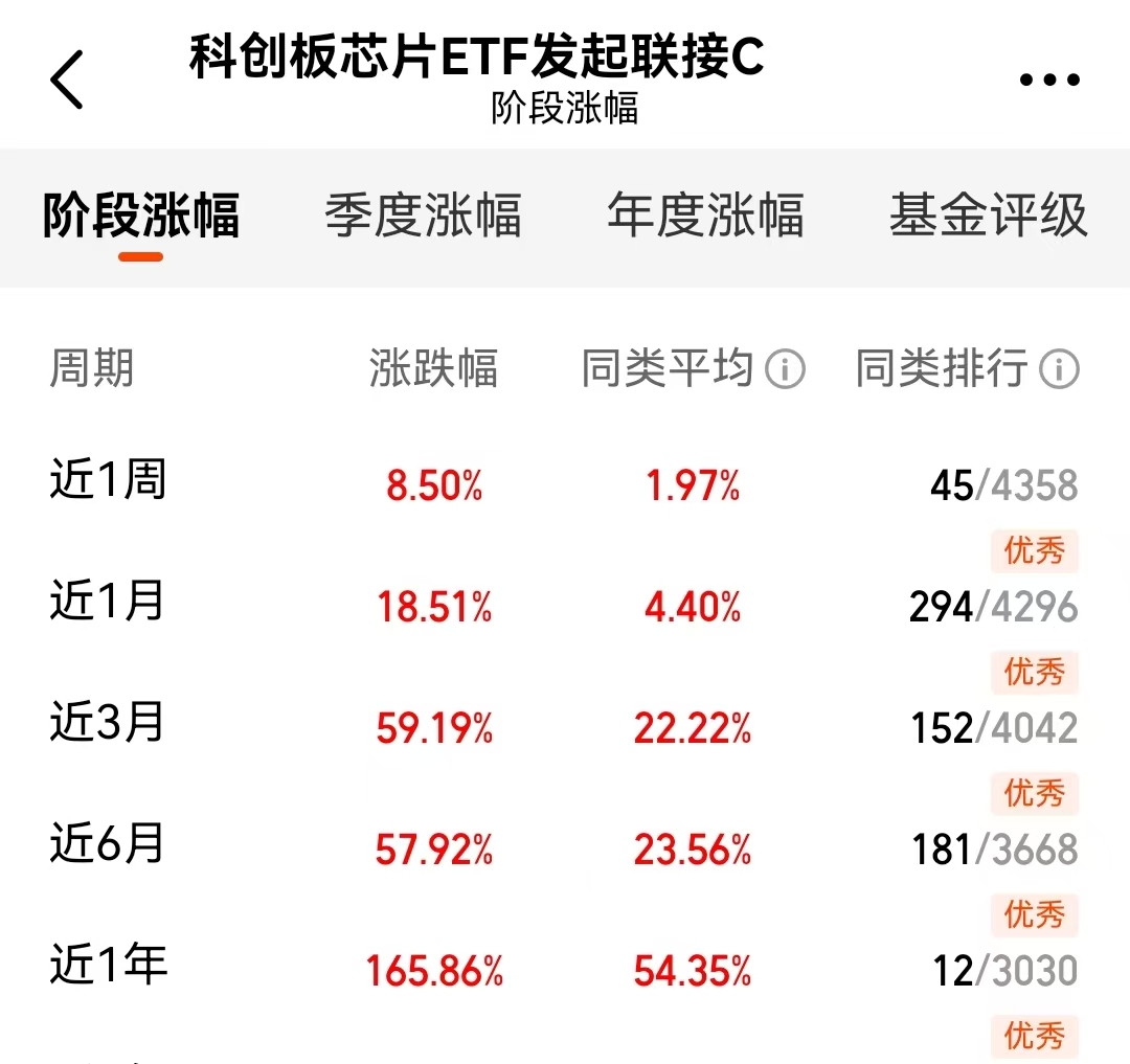 看看这曲线的斜率,$南方上证科创板芯片ETF发起联接A$(021607)近三个月59%,近一年165%,同类第一,这可不是随便能达到的。芯片行业正处在风口,技术进步和应用拓展不断推进。这种指数化的方式,分散了单一公司的风险,又能分享行业整体的成长。对于想参与这波行情的人来说,这无疑是一个很直接的工具。#创业板指创阶段新高 致敬“924行情”#