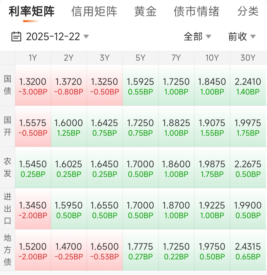今天央妈公布12月贷款市场报价利率(LPR),1年期和5年期以上LPR分别为3.0%和3.5%,均与上月持平。至此,LPR报价已连续七个月维持不变,上周市场流传的降息小作文预期正式落空。受此影响,今日债市呈现显著的分化行情。长端利率债承压明显,10年期国债收益率1.84%,30年期超长债升至2.24%,而短端利率和信用债整体平稳。