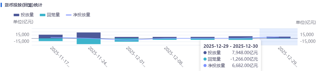其二是年末特殊的资金面与交易行为。央妈本周为维护年末流动性平稳,已连续开展大额净投放,累计释放资金超6600亿元,确保了资金面的整体宽松。然而,年末机构交投趋于清淡,一定程度上放大了单一消息或交易行为对市场价格的影响,导致波动加剧。
