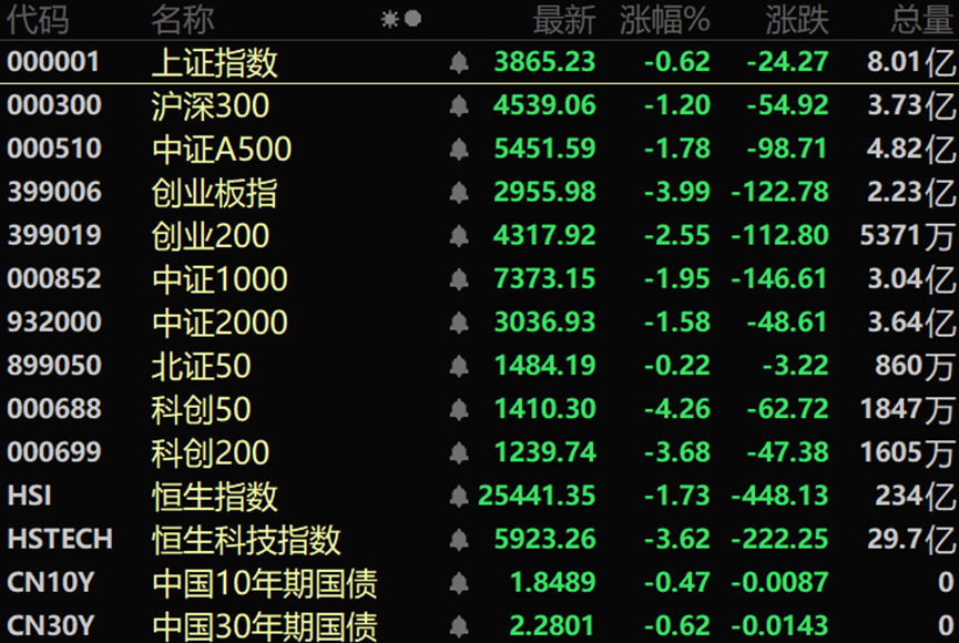 市场全天震荡回调,创业板指、科创50指数盘中双双跌超4%。沪深两市成交额2.58万亿,较上一个交易日放量2215亿。