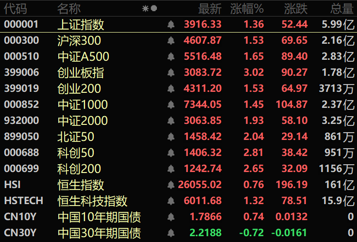 今天指数全线收红,早盘高开后有一波犹豫,但没像前几天那样直接拉垮,说明抛压轻了。创业板和科创50这些高弹性的方向涨幅靠前,是个好信号,市场风险偏好有所回升。