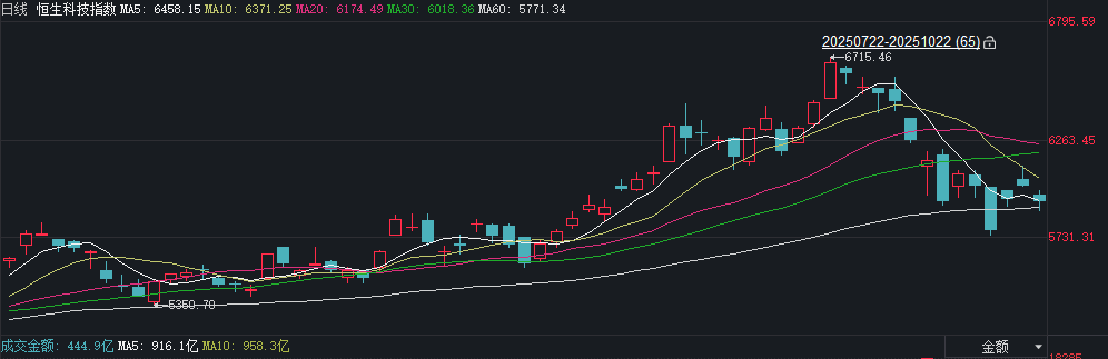 港股方面,今天同样承压,三大指数集体收跌。恒生指数下跌0.94%,恒生科技指数下跌1.14%,整体走势疲软。科技股成为杀跌主力,网易、比亚迪电子等权重股领跌,不过,泡泡玛特因三季度收益超预期,股价逆势回升2.4%。目前来看,恒科指数位置已逼近前期低点,短期趋势走弱,量能并未显著放大,或许有资金在默默承接。这个位置虽然难受,但对于拿长线的而言,吸引力也在逐步增加。鸡哥坚持站岗恒科!