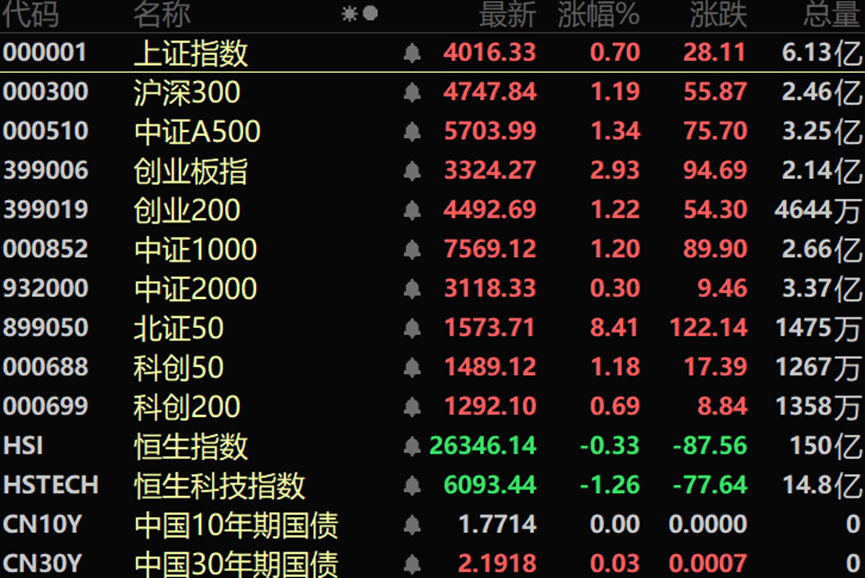 市场全天震荡拉升,三大指数高开高走,创业板指涨近3%创年内新高,沪指再度回升至4000点上方,北证50指数涨超8%。沪深两市成交额2.26万亿,较上一个交易日放量1082亿。