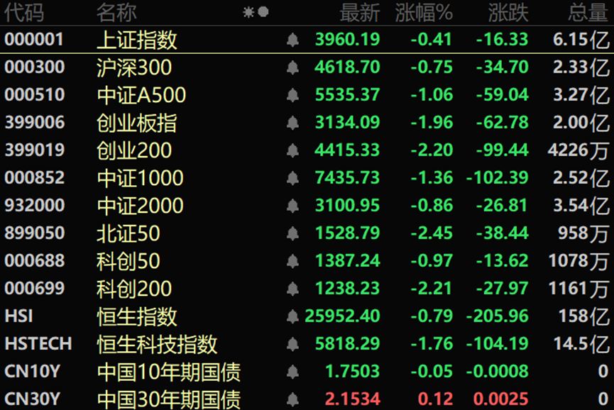 市场全天缩量调整,创业板指跌近2%。量能继续萎缩,沪深两市成交额不足2万亿,较上一个交易日缩量1914亿。