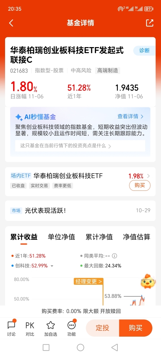 今天创业板指直接起飞,科技板块涨得让人眼馋!身边玩基金的朋友都在问“有没有跟创业板科技挂钩的基”,我直接推了华泰柏瑞——它就是跟着创业板科技方向走的,今天日涨幅1.8%,踩着行情的节奏。这基虽然是中高风险,但近一年收益挺亮眼,现在创业板行情这么活跃,想搭这波顺风车又能接受波动的,这基真可以重点瞅瞅,毕竟主线行情来了,跟上总没错。#科技热点摊开业啦#