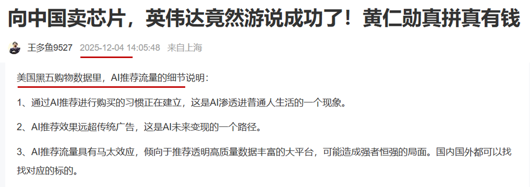 今天我的美股文章里,有一段关于美国黑色星期五购物数据,AI推荐流量的内容。