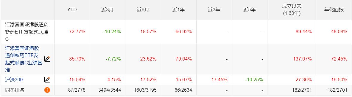 汇添富国证港股通创新药ETF发起式联接C(021031)今年以来表现堪称惊艳,累计涨幅达72%,年化回报高达48%,在同类产品中稳居前7%梯队,业绩爆发力十足。