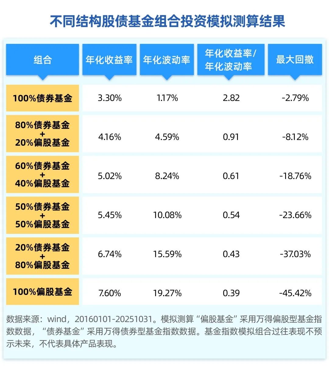 我们做一个简单测算(见下表),用偏股混合型基金指数代表权益类的偏股基金,用债券型基金指数代表债券基金,可以看到,随着投资组合中权益类基金的权重增加,虽然长期收益率提高,但收益波动也随之加大,投资风险随之升高。
