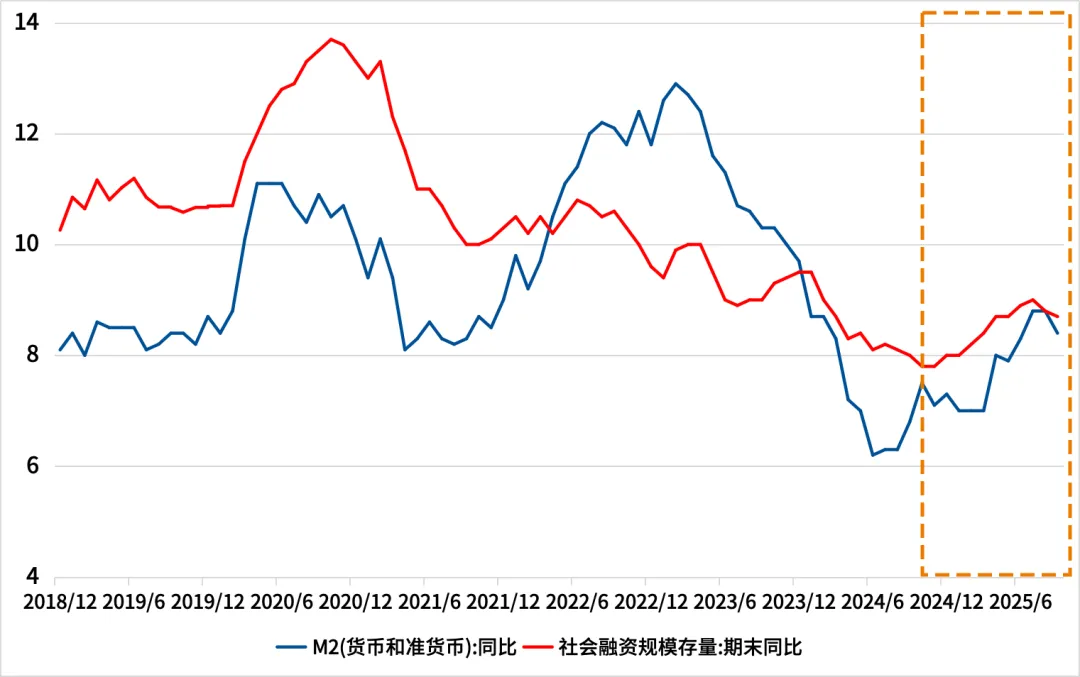 如图1橙色框所示,截至9月末,我国社会融资规模存量、广义货币供应量(M2)同比分别增长8.7%和8.4%,比去年同期分别高0.7个和1.6个百分点,增长明显提速,有力支持实体经济高质量发展。